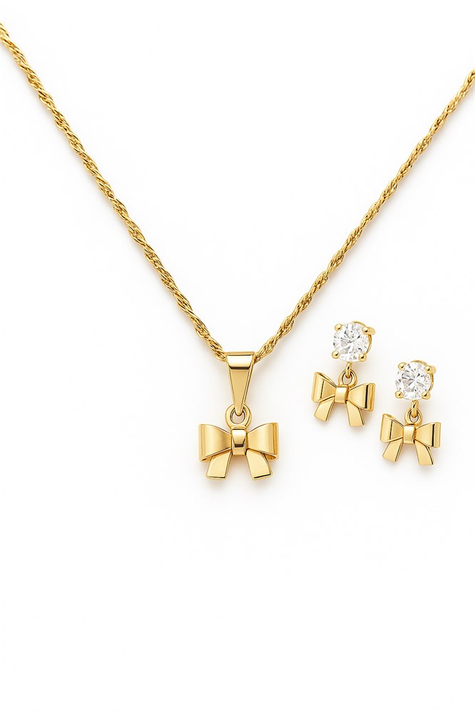 Este lindo conjunto infantil foi desenvolvido para trazer brilho e charme às ocasiões especiais dos seus filhos. Com design delicado e acabamento primoroso, combina um colar com pingente em formato de laço e um par de brincos de pedra zircônia facetada, tudo folheado a ouro 18k de alta qualidade.